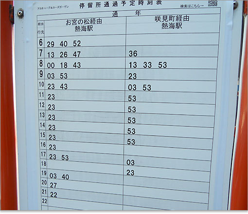 2011年10月時点の熱海行きバス時刻。お昼から夕方にかけては1時間に1本。1時間待つくらいなら、歩いたほうが早いかも。ただ、幹線道路沿いで歩きにくいところもあるので、お年寄りは歩かないほうがいいでしょう。