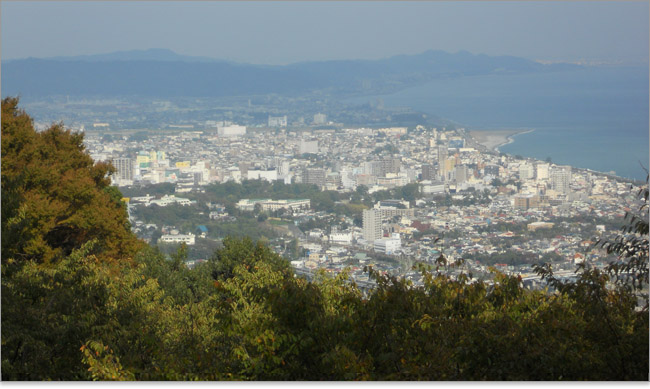 本丸の展望台にやってきました。森に囲まれているところが小田原城近辺。ただし小田原攻め当時の小田原城は、現在のところからやや離れた八幡山(現・小田原高校)にありました。惣構えでは大規模な面積ですけどね。