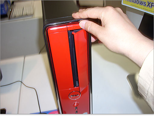 光学ドライブは縦位置ですが、トレイにツメがあるのでディスクが落下することはありません。横位置で使いたいならInspiron 545sを横置きにしましょう。