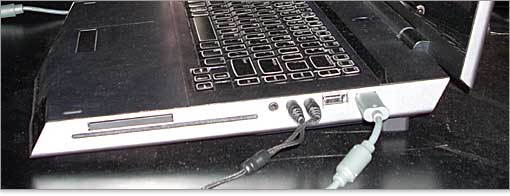 Alienware M15xの左側面。Alienware M15xが装備するインターフェースは、USB2.0が3つ。(うち1つはeSATA共有)。 IEEE 1394a (4-pin) 、VGAポート、DisplayPort 、8規格対応メディアカードスロット、ExperssCard/54mmスロット ギガビットイーサネットLAN、音声出力端子2つ、音声入力/マイク入力端子 (5.1chサポート)。
