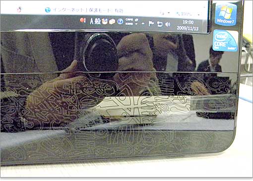 前面の下部にはパターンデザインが施された透明パネル。奥が空洞になっていて背面が透明パネル越しに見えます。左上には小さくINSPIRON oneのロゴが見えます。