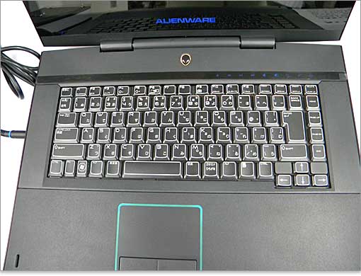 タッチパッドの縁周りにもLEDイルミネーション。Studio XPS 16よりもこってりしたキーボードデザイン。カーソルキーが独立しているところは、Studio XPS 16よりも使いやすい。