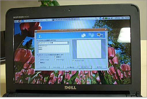 こちらのレビュー機では、XPではなく、LinuxディストリビューションであるUbuntuを搭載しています。Inspiron Mini 10vではカスタマイズで、Windows XPかUbuntuのどちらかのOSを選ぶことができます。