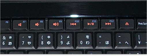 「イジェクト、再生、一時停止、スキップ、バック、音量調整」などコンテンツ操作をボタンひとつで行えます。ファンクションキーと共有になっているので、ファンクションキーを使うときはFnキーと同時に押します。また、ただし、設定すればファンクションキーを優先にすることもできます。