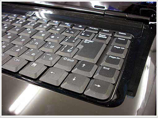 キーピッチやキー・ストロークは通常のノートパソコン同様です。キーボード配列に特異なところはありませんが、ここ数年のDELLノートの特徴でEnterキーが2列目に配置されています。ただし、EnterキーとPgキーの間には充分な空きがありますし、Enterキーの面積が大きいので不具合を感じることはありません。