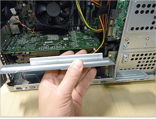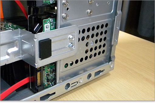 この固定具はHDDの側まで来ていて、おかげでSATAケーブルはL型コネクタでないとぶつかってしまいます。また、頻繁にHDDを取り外すことがあるなら、上段のHDDベイに取り付けたほうがいいでしょう。