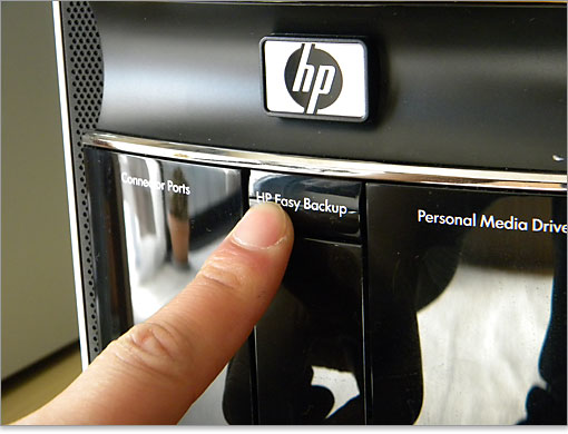 HPロゴの下には、HP Easy Backupボタンを配置。ワンタッチで“HP Easy Backupが起動、NTFSディスク上のファイルを簡単にバックアップ。 バックアップするファイルの種類を選択でき、バックアップの頻度も、毎日、毎週、毎月、時刻の設定がおこなえます。 また、保存先を、ハードドライブ、CD、DVD、HPパーソナル・メディア・ドライブ(500GB/1TB)、HPポケット・メディア・ドライブなどに設定できます。