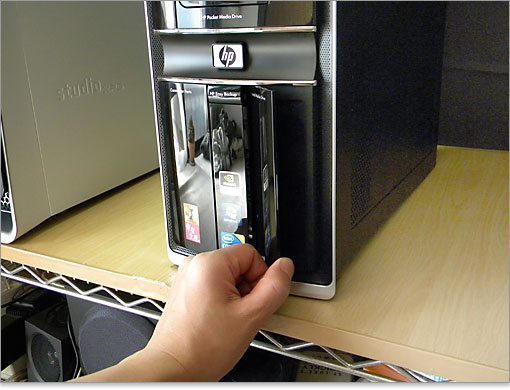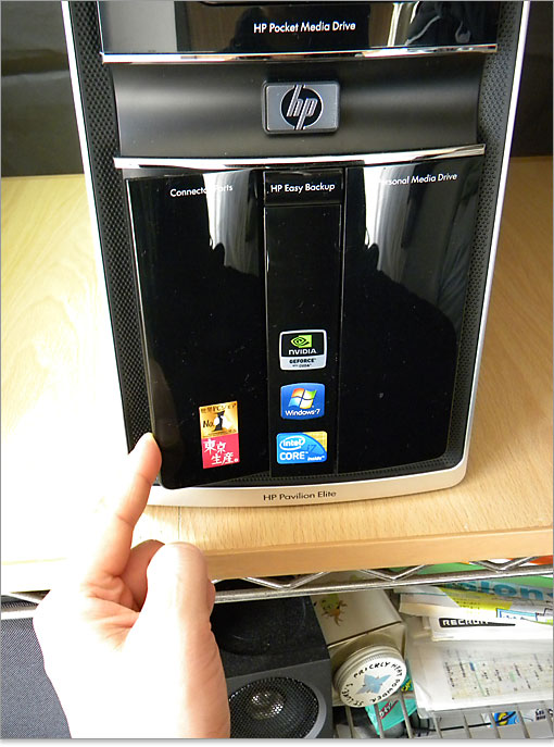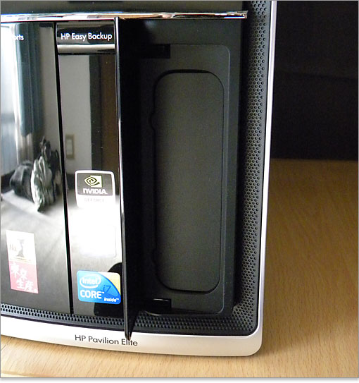 2つの光学ドライブベイの下には、HP ポケット メディア ドライブを挿入するスロットがあります。HP ポケットメディアドライブは、2.5インチHDDを採用したHP専用のカートリッジです。着脱可能なストレージで、USB外付けHDDとしても使えます。いまのところHDDが記録媒体として大容量なので、大きなデータ量をバックアップするには便利ですね。