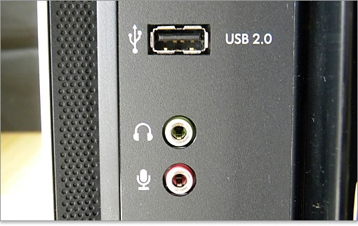左のバタフライドアを開けると、USB2.0ポート、ヘッドフォン出力、マイク入力があります。ドアを開けたものの、USB端子が1つだけとはちょっと物足りないですね。