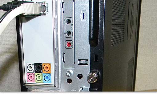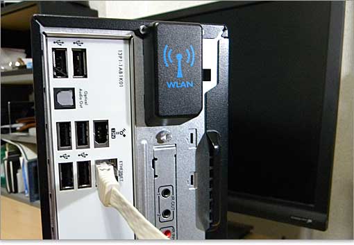 USB端子が6つ(前面と合わせて8つ)、IEEE1394が1つ、光デジタル音声出力が1つ、ギガビットイーサーLANが1つ。ワイヤレスLANを搭載するとこのような「WLAN」と書かれた保護カバーが付きます。