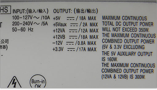 電源で肝心な+12V系は2系列。それぞれの最大は12Aと18A。(Wで見るときは100Vをかければいいです)。