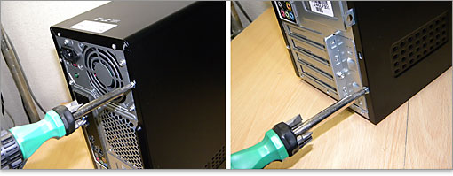 上下2箇所のネジをドライバで外せば、左側面パネルが外せます。