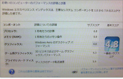 | Windowsエクスペリエンス・インデックスのスコア | |