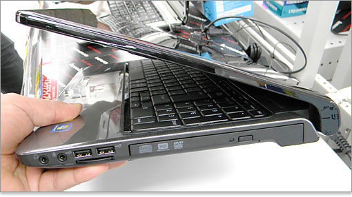 非常に薄型設計されているところも注目ポイントです。最薄部分で2センチほどしかありません。Core 2 Duo時代では2つあったチップセットも、Core i3/i5から1つとシンプルになったため、設計面積にゆとりができたのでしょう。