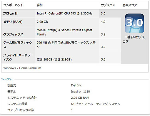 今回のInspiron 11z(1110)にて、Windowsエクスペリエンス・インデックスのスコアをチェック。現在のエントリーノートの性能と比べると、決して高いパフォーマンスではありません。