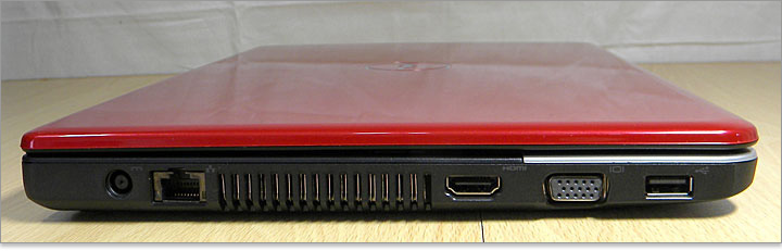 左側面には、電源コネクタ、ギガビットイーサーLAN端子、通気口、HDMI端子、VGA端子、USB端子1つ装備。