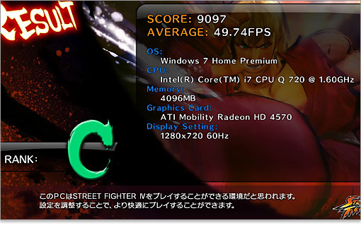 フルスクリーンを解除して、もう一度ベンチマークを測ったところ、RANK DからCへ向上。49.74FPSと出ています。フルスクリーンといっても、解像度は変わらず引き伸ばしているだけなのに、なぜ、高負荷になるのか不思議です。