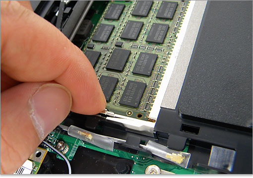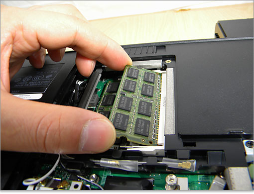 メモリの増設は、逆の手順で行います。斜めに装着されたメモリは押し込むことで、定位置にロックされます。