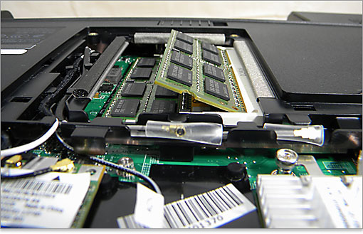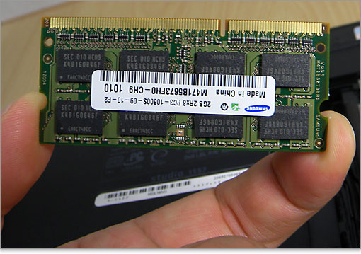 レビューしているこのStudio 15では、DDR3-SDRAMの2GBメモリが2枚搭載されています。メモリは2スロットなので、メモリ容量アップの際は交換という形になります。仕様では8GBメモリまで対応しているようです。