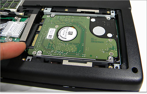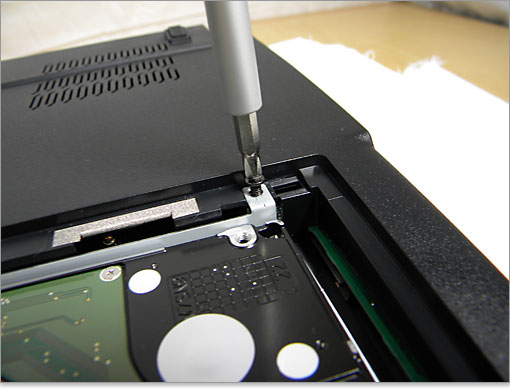 Studio 15では2.5インチSATAのハードディスク(HDD)が採用されています。今や320~500GB HDDは当たり前となっており、ノートパソコンでも大容量のデータを蓄えることができます。あえて独自に大容量HDDに交換する必要もないでしょうが、交換方法について紹介します。ユーザーが交換をする場合は、保証対象外ですので、自覚の上行うようにしてください。通電していると危険なので、ACアダプタはもちろん、バッテリーは外しておく必要があります。でないと、待機電力が流れているのでショートする可能性があります。