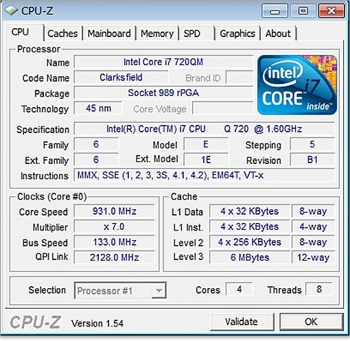 今回はクアッドコアのCore i7 720QMを搭載しています。インテルのコードネームではClarksfield。45nmプロセスによる設計で、1世代前になります。Core i3/i5は下位であっても後発であるため32nmプロセスという微細設計です。Core i7 720QMでは以下のテクノロジーを実装しています。