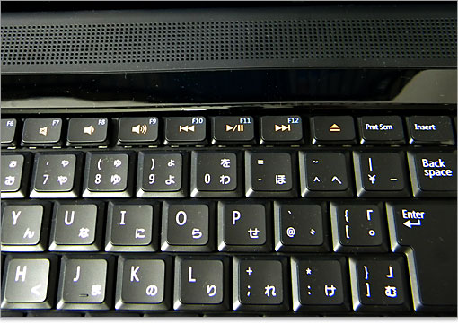 一行目に位置するファンクションキーは、切り替え機能や調整機能ボタン、マルチメディア・キーと併用になっています。そのため、初期設定ではファンクションキーを使うには、Fnキーと組み合わせます。F6だけフリーになっていますね。