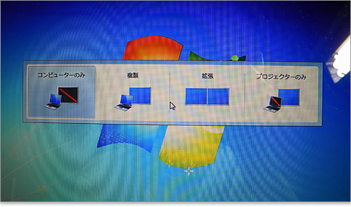モニタ切り替えボタンでは、外部モニタ接続時の画面切り替えが行えます。もちろん、Windows側の操作でも可能ですが、こちらのほうが楽です。両画面に同時表示する「複製」、2画面分を表示領域に使う「拡張」、外部モニタだけを表示する「プロジェクターのみ」の切り替えがあります。余談ですが、「プロジェクターのみ」の表記は適切ではないような。要するにStudio 15の画面はオフということです。