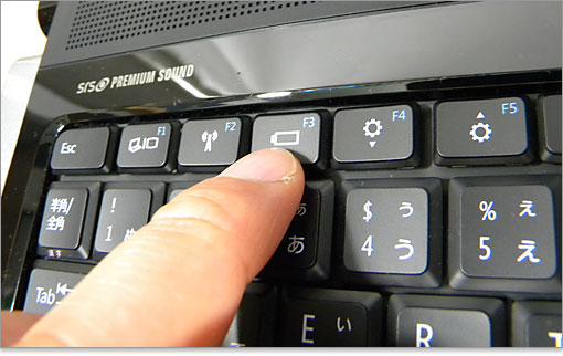 では、ファンクションキーにある機能ボタンを紹介します。こちらは外部モニタに接続したときの切り替えボタン。