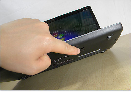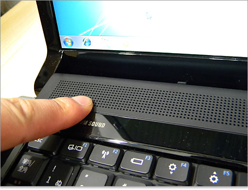 ステレオスピーカーは、キーボード上部にある無数のパンチ穴の列に配置されています。下位のInspiron 15は底面にスピーカーが配置されていますが、Studio 15ではもっともモニタ近くにあり、自然な印象があります。