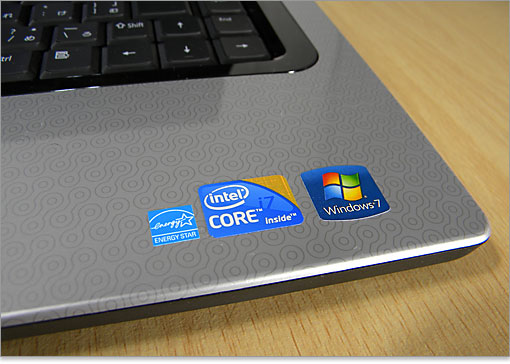 パームレスト右側にはCore i7とWindows 7のブランドシール。構成次第でCore i3やi5の場合もあるでしょう。半光沢で、ギラギラした印象はありません。多少、指紋が付着しても極度に目立つことはありません。