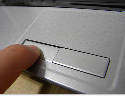 DELL Studio 15のキーボード周辺である、パームレストとタッチパッドを中心にデザイン面も含めて観察していきましょう。キーボード自体は非光沢ですが、その縁取りのブラックは光沢であり、トーンの変化でうまくデザインをまとめています。