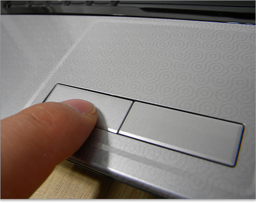 タッチパッドは、パームレストと一枚板になっています。ただし、表面加工は変えてあるので、パームレストは滑りにくく、タッチパッドは滑らかに滑りやすくなっています。タッチパッドの面積はスタンダードで、クリックボタンは扱いやすいサイズです。