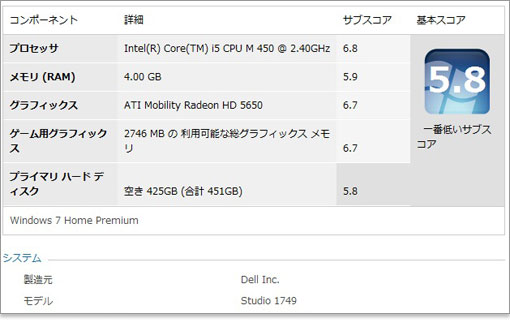 | グラフィックス | ATI Mobility Radeon HD 5430 1GB | 4.9 |
