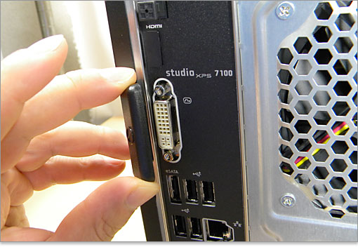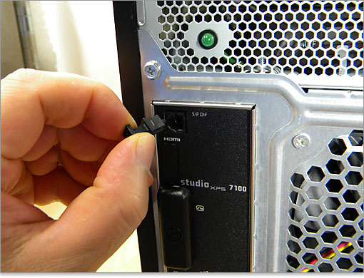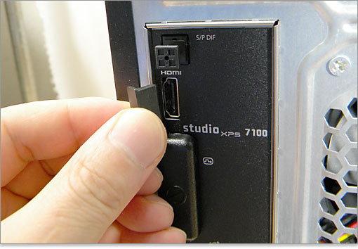 デジタル出力のHDMI端子にもキャップが付いていますが、こちらは防塵用というよりも接続しないように塞いでいます。グラフィックカードを搭載しないローエンド機ならこのオンボード端子を使いますが、Studio XPS 7100はハイエンドなので、HDMI端子はグラフィックカードについている端子を使います。