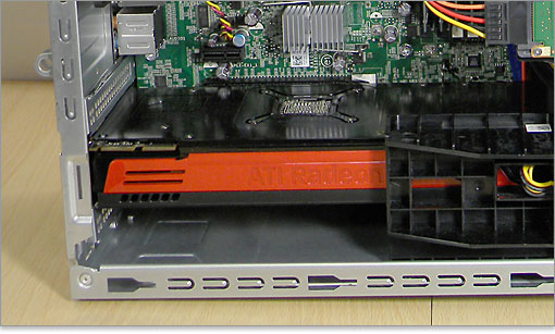 今回のATI Radeon HD 5870は厚みがあるため2スロット分を占拠しています。しかも、一番下段のPCIスロットはATI Radeon HD 5870にぶつかるため、PCIカードの搭載は不可です。一番上のPCI Expressx1は空きがあり、ここしか使えません。
