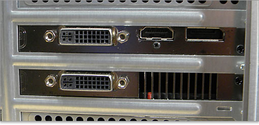 今回のグラフィックカードのATI Radeon HD 5870では端子に、DVDI×2つ、HDMI、DisplayPortを装備しています。(※装備する端子は搭載するグラフィックカードによって異なります。)