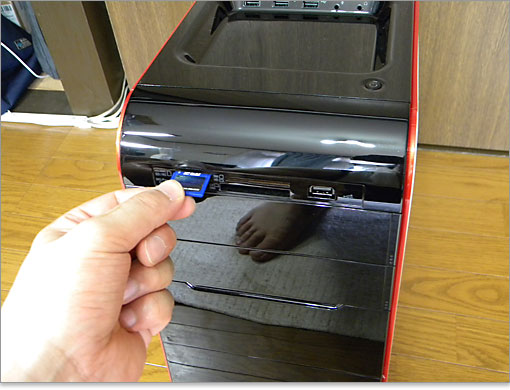前面上部には19規格対応のメディアカードスロットを標準装備。その右隣にUSB端子を1つ装備。むき出しになっているので、手短にアクセスが可能です。