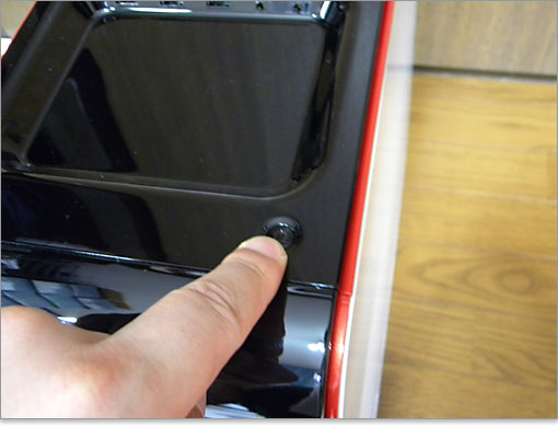前面から天井にかけて光沢ブラックがつながっているデザインです。エッジに赤いラインが走っており、デザインのアクセントになっています。