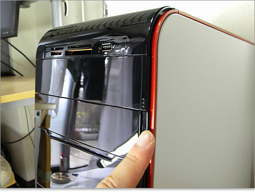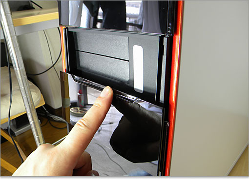 スライドドアを下げると、外部3.5インチベイが2つ。フロッピーディスクやMOドライブなどを増設するのに活用されますが、最近ではあまり必要性がなくなってきているように思われます。