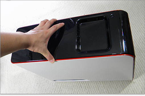 サイズは、奥行き493mm x 幅198mm x 高さ528 mm。重量は約20kgほどです。サイズとしては、自作パソコンではメジャーなATXケースほどです。前面と背面にはリフトポイントと呼ばれる窪みがあり、このように持ち運びしやすいデザインになっています。