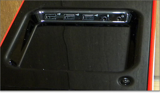 Studio XPS 9100の前面にはUSB端子が1つしかないので、このメディアトレイにあるUSB端子がメインに使われそうです。USB機器は斜めに差し込まれるので、上からの圧力には気をつけたいです。うっかり、重い本を置いたりしないように。