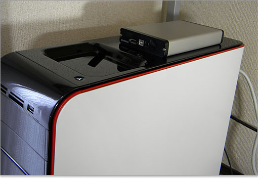 メディアトレイの後部はフラットで、ゆったりした面積があります。3.5インチタイプの外付けHDDを置いておくのもいいです。
