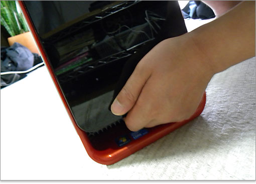 Studio XPS 9100には持ち運びしやすい工夫がされており、2箇所のリフトポイントなるものがあります。それは、背面上部にある窪み部分と、前面の通気口部分です。