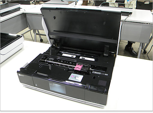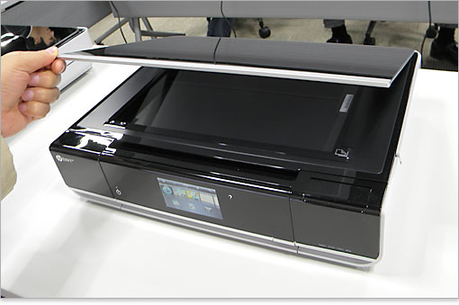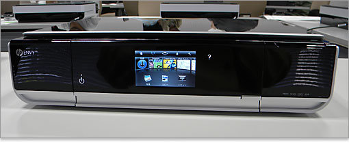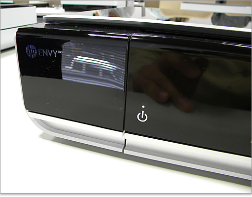 次は、HP ENVY100を試してみます。こちらもC310c同様、新機能のメールdeプリント(ePrint)とアプリdeアプリ(Print Apps)を搭載しています。見た目がDVD/ブルーレイレコーダーのようで、プリンターとは思えないスタイリッシュなデザインです。