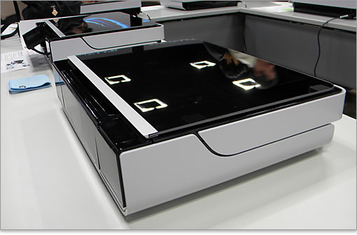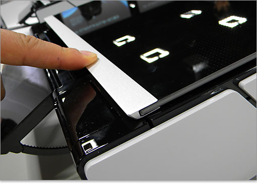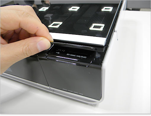 給紙トレイ。出力も前面からです。データを読み込ませるメモリーカードスロットとUSB端子も前面にありますし、操作はすべて前面で行えるよう配慮されています。無線ですし、リビングのオーディオラックに配置するには最適な仕様です。
