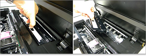 紙詰まりの時は両端のレバーをつまんだまま持ち上げて、ユニットを取り外します。
