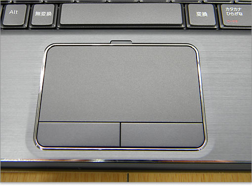 タッチパッドエリア縁周りはメッキの枠になっており、高級感があります。パームレストをプレスした一体型タッチパッドと比べると、メリハリがあってシャープなデザインです。