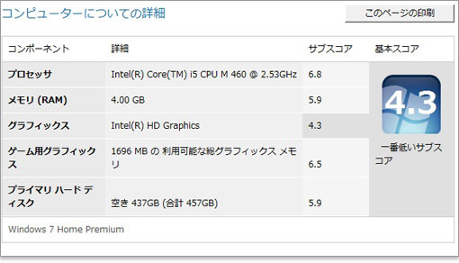今回のXPS 14の構成であればNVIDIA Optimusテクノロジーが有効でした。Windows エクスペリエンスインデックスを見ると、ゲーム用グラフィックスのスコアが6.5となっており、GeForce GT 420Mのスコアと思われます。ただし、このWindows エクスペリエンスインデックスにとってNVIDIA Optimusテクノロジーが未知だったのか、表示にはGeForce GT 420Mの名がでてきません。