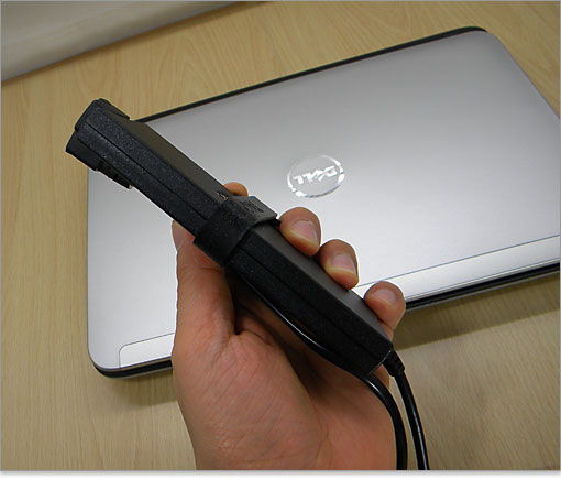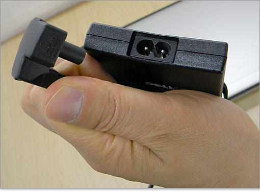 XPS 14の90W ACアダプタでは、L字型の電源ケーブルをACアダプタ本体に接続して使います。