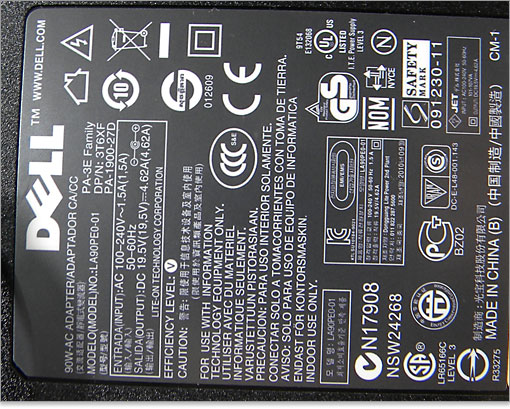 XPS 14に付属するACアダプタを紹介します。今回レビュー機では90Wタイプです。GeForce GT420M搭載時は90W ACアダプタということでしょう。仕様では130Wタイプもあるので、こちらはGeForce GT425M搭載時と思われます。構成次第で今回紹介した性能よりももっと高くできるということです。2010年12月レビュー時点の内容ですので、構成についての最新情報はDELLサイトでチェックしてください。⇒XPS 14 販売終了